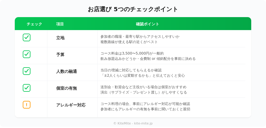 アレルギー対応: コース料理の場合、事前にアレルギー対応が可能か確認しておく。参加者にもアレルギーの有無を聞いておくと親切。