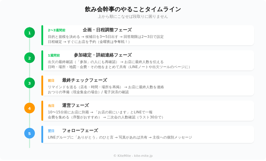飲み会の幹事がやることは多いように見えますが、時系列で整理してしまえば一つひとつはシンプルな作業です。大変なのは「何をいつやればいいかわからない」という状態であって、やることリストさえあれば誰でもこなせます。