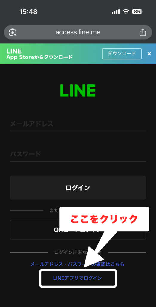 Twitter(X)やInstagram、Facebookなどのアプリ内でURLを開いている場合、LINEログインが正常に動作しないことがあります。 画面のメニューから「ブラウザで開く(Safariで開く / Chromeで開く)」を選択し、標準ブラウザで開き直してからログインをお試しください。