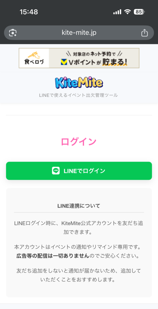 A. 申し訳ありません。現在、KiteMiteの利用(イベント作成・回答)にはLINEアカウントが必須となっております。ただし、公開のイベントページの「閲覧」だけであれば、ログインなしでも可能です。