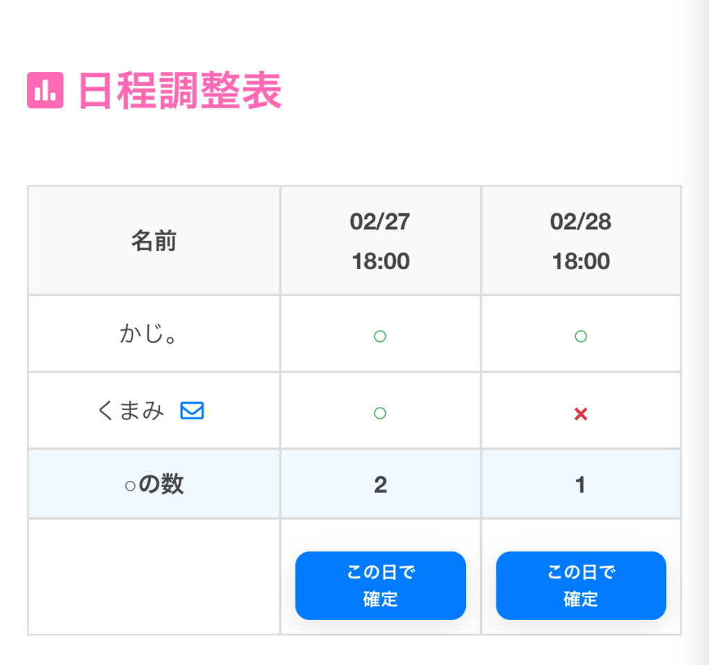 - ランキング表示: ○の数が多い候補日が自動的に上位に表示されるため、全員が参加できる日がひと目で分かります。
