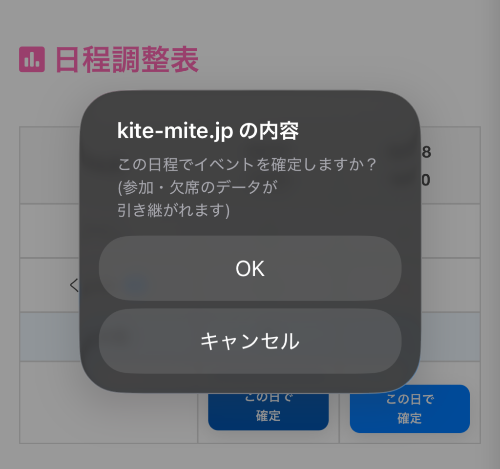 - 日程の確定機能: 投票が集まったら、主催者はボタンひとつで「この日で開催!」と決定できます。決定すると、参加者全員にLINEで確定通知が届きます。